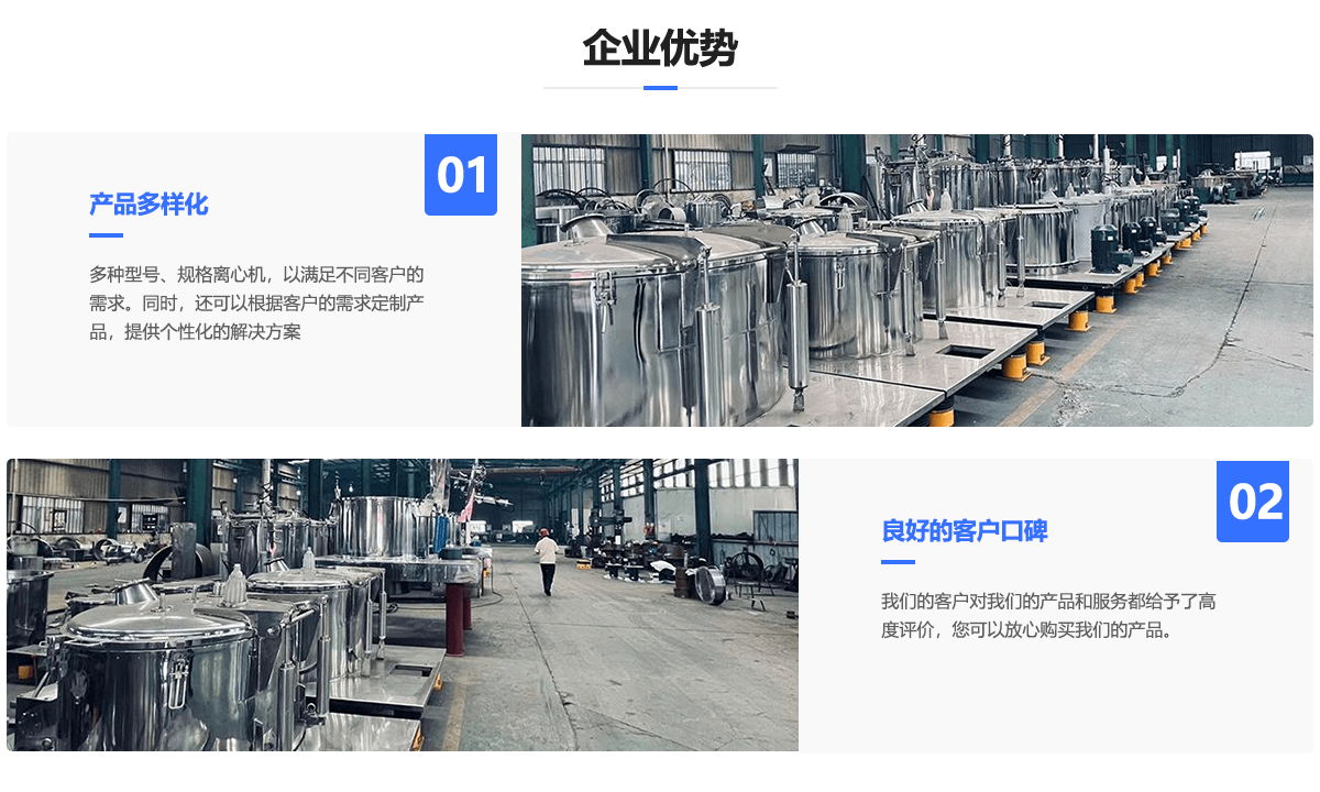 公司技術力量雄厚,加工裝備齊全,檢測手段專業,離心機產品有十三個系列五十余種規格,其中三足式離心機和全自動離心機品種齊全,規格眾多,材質多樣,嚴格執行GB/T13756《三足式離心機型式和基本參數》和GB/T13755《三足式離心機技術條件》,市場占有率高。